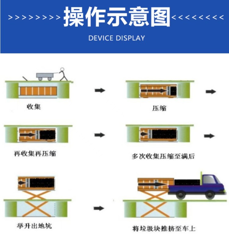 ◇平穩(wěn)可靠:兩側(cè)舉升,剪叉跨度大,升降平穩(wěn),無傾斜; ◇淺地坑:地坑深度僅為1.55m,保潔及維修極為方便; ◇高效率:壓實(shí)每噸垃圾時(shí)間≤10min; ◇全封閉水平壓縮:采用水平壓縮方式,垃圾壓縮密度≥0.86t/m3,垃圾壓縮后體積大大減小,從而大幅度提高轉(zhuǎn)運(yùn)車輛裝載量和轉(zhuǎn)運(yùn)效率,降低垃圾處理、轉(zhuǎn)運(yùn)等費(fèi)用; ◇動(dòng)作少,故障率低,整套設(shè)備的垃圾壓縮、裝車由三個(gè)動(dòng)作完成,簡單實(shí)用,各動(dòng)作之間安全互鎖,防止操作人員誤操作造成安全事故,安全可靠; ◇垃圾儲(chǔ)存、壓縮及寄存全部在地面以下,地面上沒有垃圾散落,對(duì)環(huán)境影響較小,環(huán)保性好;垃圾壓縮后密度高,水份少,可避免汽車運(yùn)輸中的垃圾散落、污水滴漏現(xiàn)象,避免二次污染; ◇土建費(fèi)用低,占地面積小,可以不蓋大型工作間,既節(jié)約了投資,也縮短了工期; ◇留有專門的維修窗口,維修保養(yǎng)方便; ◇設(shè)有固定式操作和遙控器兩種操作模式,方便實(shí)用; ◇自動(dòng)化程度高,可大幅提高工作效率,降低勞動(dòng)強(qiáng)度。